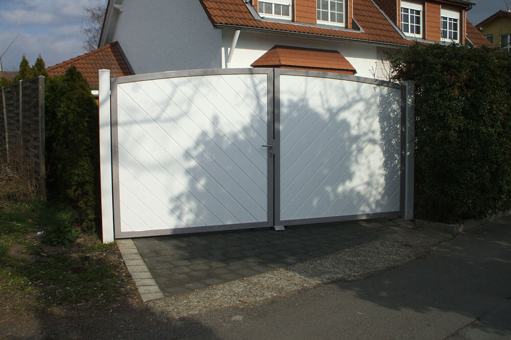 Ab einer Flügelbreite von 120 cm sorgt ein zusätzlich aufgedoppelter ALU-Rahmen für maximale Steifigkeit. Für eine präzise Ausrichtung sind alle Tore mit 2-D justierbaren Edelstahl-Winkelbändern verschraubt.