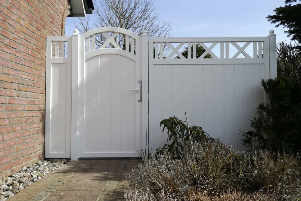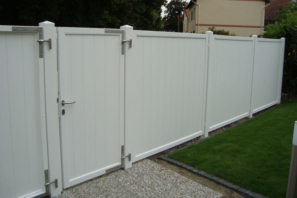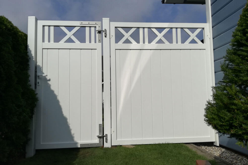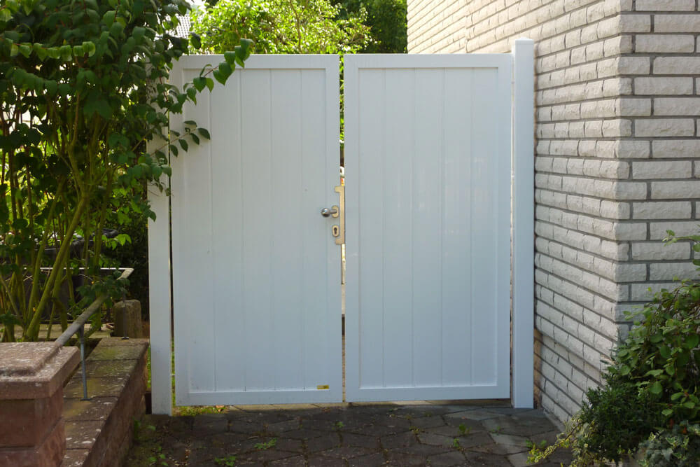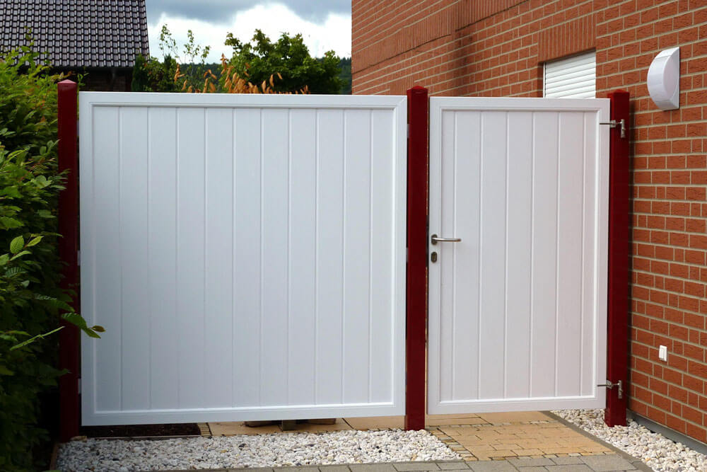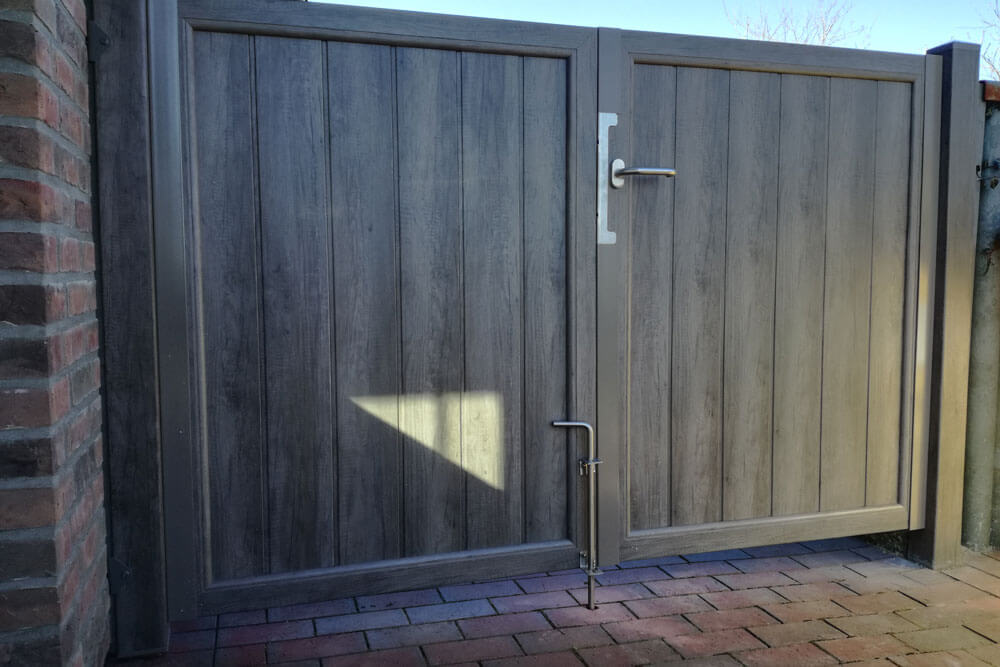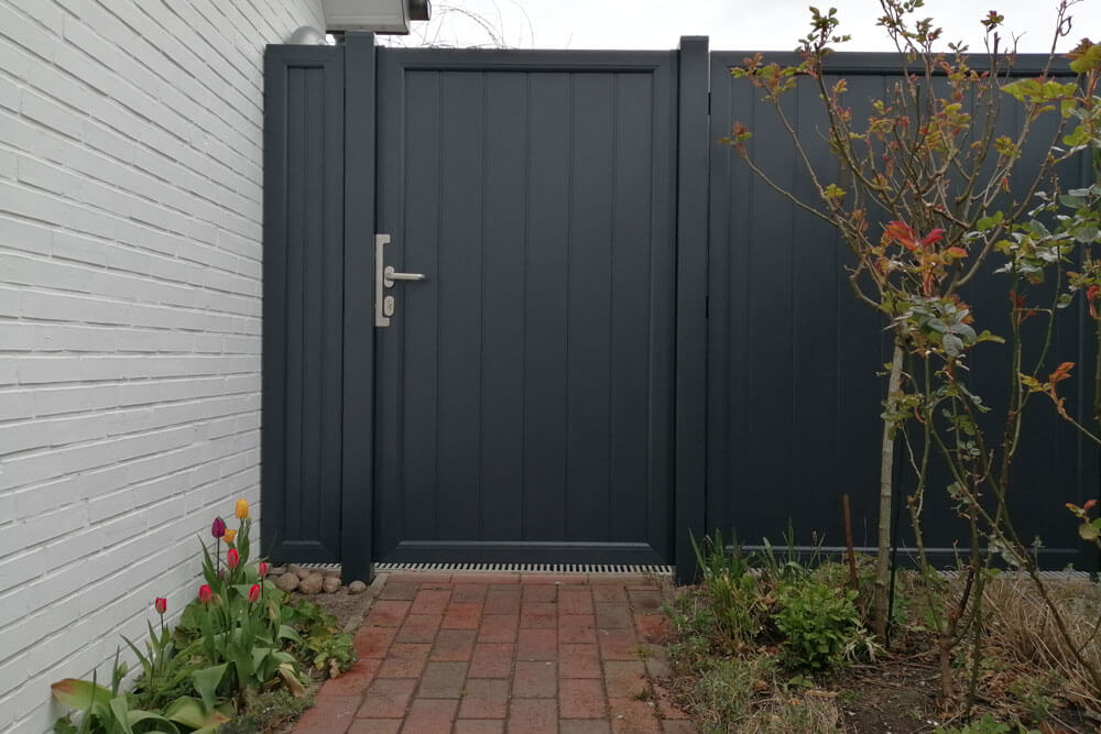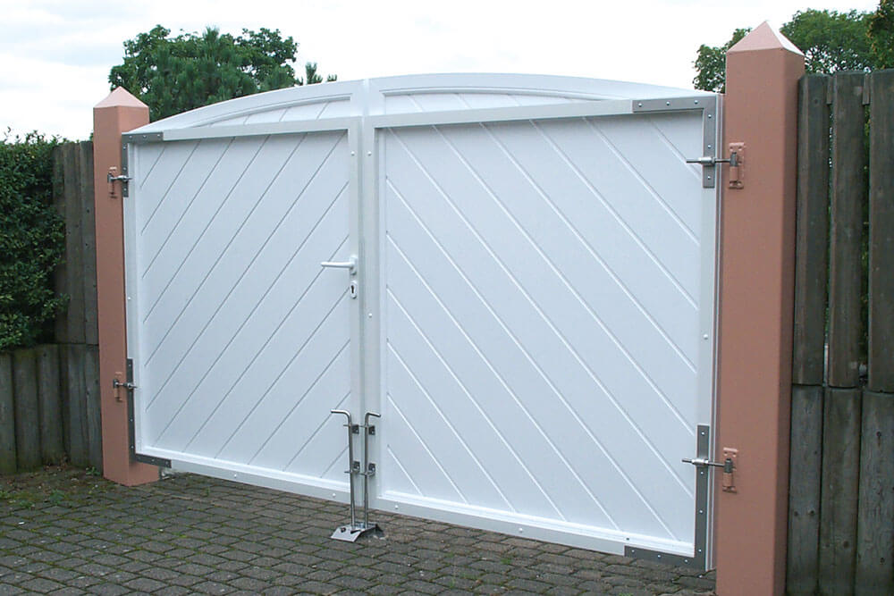Alle Megaline-Sichtschutzelemente können als Tore konfektioniert werden, sowohl in rechtwinkliger als auch segmentförmiger Ausführung. Die Torrahmen sind rundum mit einem ALU-Quadratrohr ausgesteift.